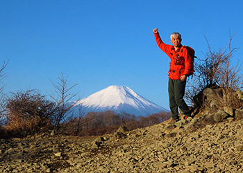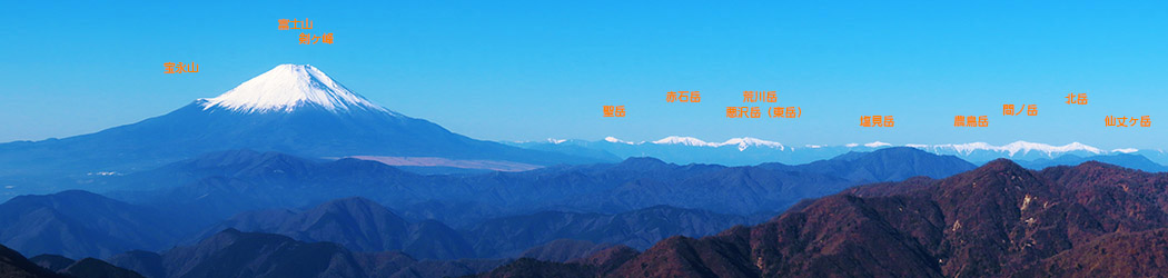 花立山荘まで登ると山火事の影響は見られず、澄んだ空の下で富士山や南アルプスが雪を被り輝いていた。
