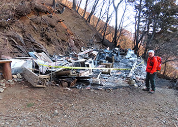 しかし、小屋の前に置いてあったベンチやテーブルは無傷で残っており、登山道には焼け焦げた痕はあるものの通行には支障ななかった。