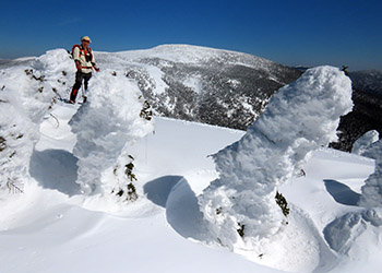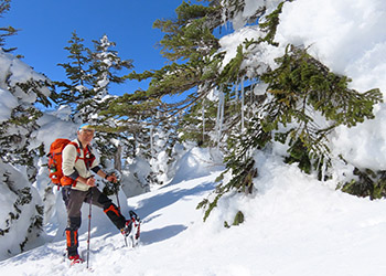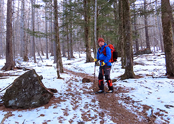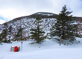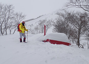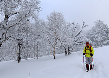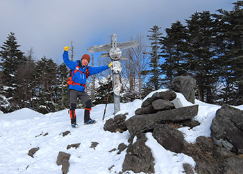 念のためスノーシューを担いで登山開始。中間点の幸徳平を過ぎ、山頂には予定の1.5倍程の三時間半もかかってしまった。スノーシューを使う事は無かった。