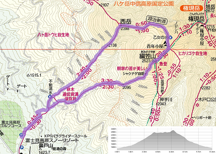 富士見高原(1340m)[7:00]→不動清水(長命水)→小広場→西岳(2398m)[10:30/10:55]→青年小屋[11:50/12:10]→網笠山(2534m)[12:45/13:05]→臼久保岩小屋跡→仝[15:50]