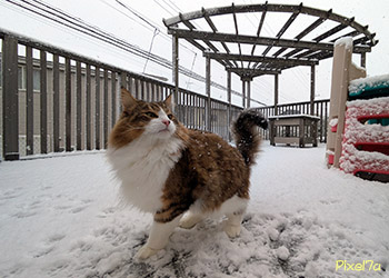 神奈川県に2年振りとなる大雪警報が出され、東名高速道路・圏央道・西湘バイパスは通行止めとなった。我が家のウッドデッキでは、“御霊ちゃん”が大慌て!