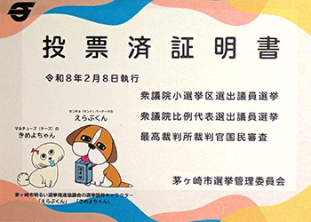 全国的な大雪の中で行われた衆議院選挙の結果は、‘自由民主党’が316議席となり、単独で2/3(310)議席を越え、‘日本維新の会’との連立与党では3/4議席を越える大勝となった。初めて、投票済証明書を頂いた。 |