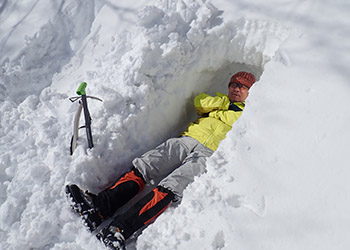 午前中はツェルトの貼り方を学び、一人用の雪洞造りに挑戦した。午後は横穴の雪洞と縦穴の雪洞を掘った。雪洞の中は風が遮られ予想以上に暖かいぞ!