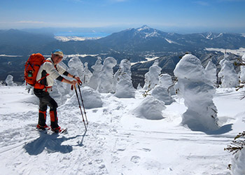 ゴンドラ山頂駅を降りて磐梯山や猪苗代湖を眺めながらゲレンデを登山口まで登った。登山口からは樹林帯でスノーシューを装着したのだが、予想以上に疲弊しベースダウンしてしまった。@異常な暑さA人が多くて自分のペースが保てないBシャリバテなどが思い当たった。