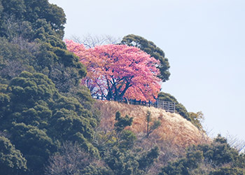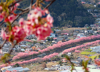 河津桜の咲く河津城山山頂からは、川沿いに咲く桜並木が一望できる絶景スポットになっている。