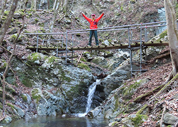 ウシロ沢にある滝の真上に架かる木橋では、股の下を流れる落ちる滝が面白い。