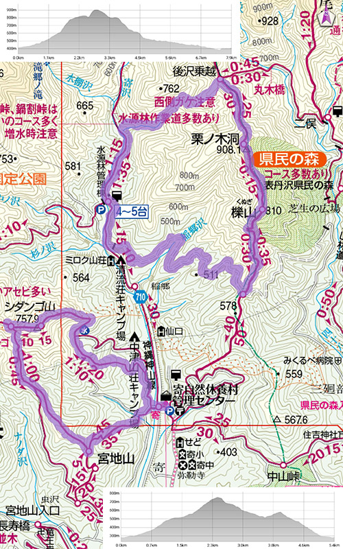 寄(280m)[11:25]→シダンゴ山(758m)[13:05/13:30]→宮地山分岐[14:15]→仝[14:55]