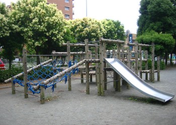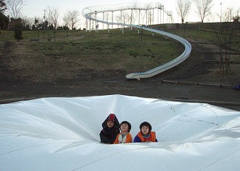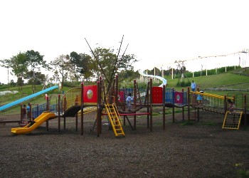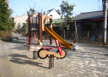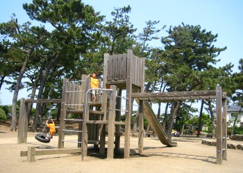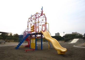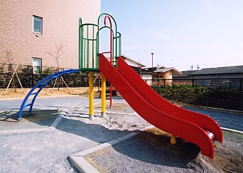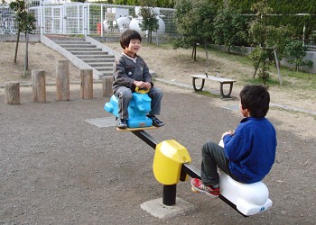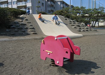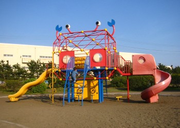 ![]() 2004年4月10日 公園内で一際目立つ“カニをモチーフとした遊具”は小さな子供でも楽しく遊べる。 両側にある波型と渦巻き型の滑り台は、滑りが良くて楽しい。 |