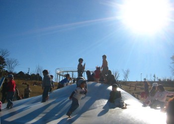 ![]() 2004年11月2日 天気の良い平日の午後で、母親に連れられた小さい子供が多かった。 公園にある石の滑り台は、幅が広くてツルツルしているので、いろんな遊びが出来る。 |