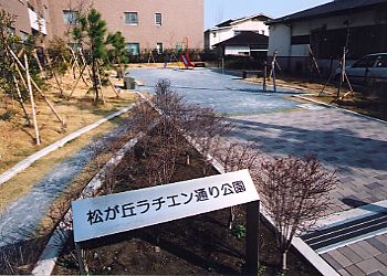 ![]() 2004年3月14日 “ラチエン通り”沿いにある松が丘郵便局の隣に造られた小さい公園。色鮮やかな滑り台が目を引く。 ラチエン通りの名前の由来を記した看板が設置されている。 |