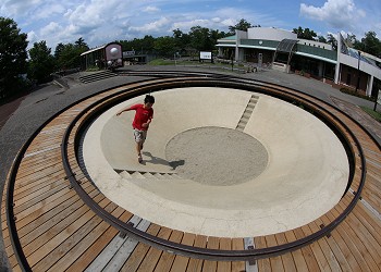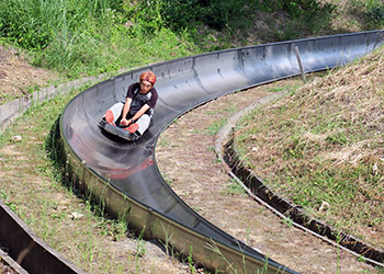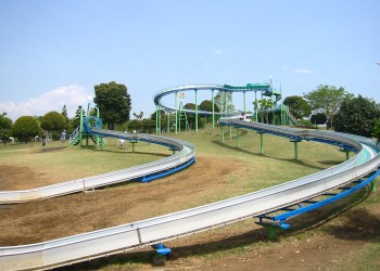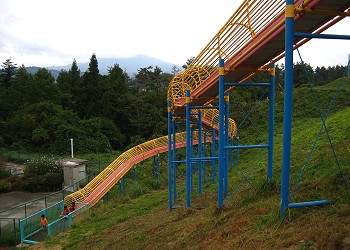 「芝生の丘」には丘の上から滑り降りる109mと33mのローラー滑り台がある。 |