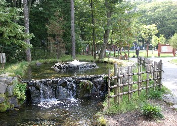親水場では、滝のように水が流れ出ていて水遊びが楽しめる。その水は、公園内を流れる小川の水源となっている。 |