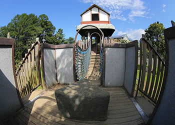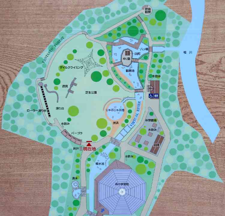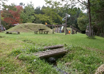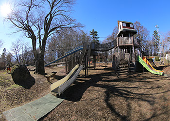 聳え立つ見晴台の様な大型遊具には、「三分一湧水」を模した三角形の石が置かれ、3つの滑り台に分岐している。 |