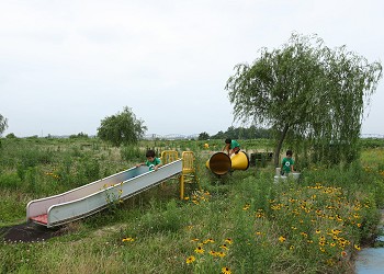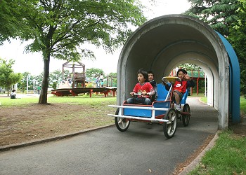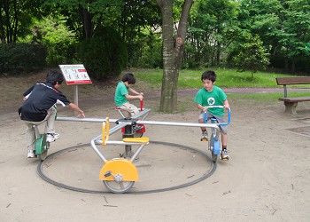 整備されておらず、雑草が生え放題になっている。遊具は草に埋もれて所々に観ることができるが、意外と動きは良く色も綺麗である。 |