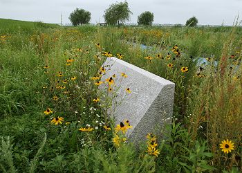 大型遊具にある2つの滑り台や吊り橋とそこへ登る階段の分岐点には、三角形の石が置かれている。 |