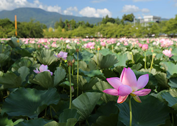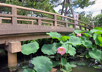 開催(6月30日〜8月19日)され、池には中尊寺より譲り受けた‘八百年の眠りから覚めた奇跡の蓮’が花をつけていた。 |