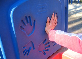 ![]() 2007年2月4日 幼児用の遊具(キッズコンビネーション)には、大小の手形を象った凹みが付けてある。 3年前に初めて公園に来た時には小さかったのに、手も大きくなったなぁ〜。 |