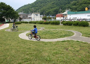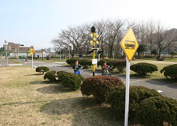 ![]() 2007年3月3日 自転車の安全な乗り方を習得する練習場。踏切や信号機のほか、S字カーブやメガネカーブに凸凹道もある。 自転車は持ち込みもできるし、貸し出しもしている。 |