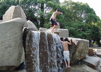 涼をもとめて「流れの広場」を訪れたが、子供達は、砦の滝登りに夢中だ。 |