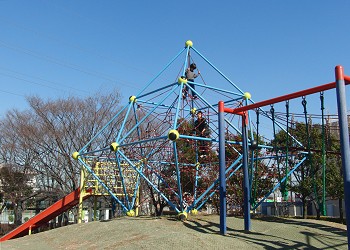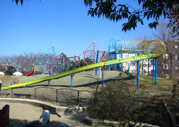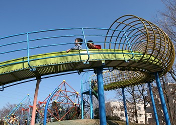 「遊具広場」にあるローラーすべり台は気持ちがよい。2つの“ジャングルジム”をつないでいる橋の部分が使用中止になっていて残念。 |