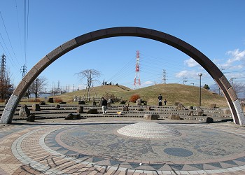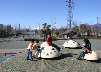 南北に走る園路の西側には「古墳広場」があり、東側には「遊具広場」と「多目的広場」がある。 |