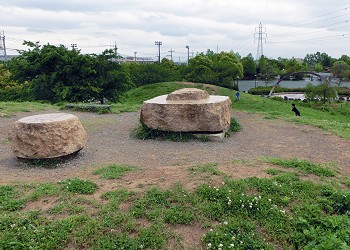 2014年5月6日 (FuMaSy) “大塚山古墳”を再現した小山の頂上付近は少し広くなっていて石のベンチが置いてある。