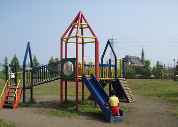 「子供広場」は穴場的な広場で遊ぶ子供は少ない。SLを模倣した木製の遊具がある。 |