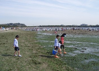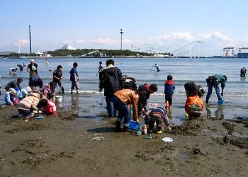 此処は、神奈川県内で“潮干狩り”ができる数少ないポイントの一つ。春から初夏にかけての大潮の頃には、潮干狩りで賑わう。 |