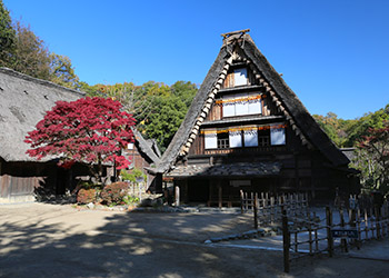 2020年11月17日 (solo) 日本民家園にある“そば処白川郷”では、茅葺き屋根の軒先に干し柿が吊してあった。