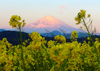 2024年1月13日 (solo) 年明けと共に‘早咲きの菜の花’が見られることで知られている。日が出る頃には、赤く染まった富士山との素敵な競演を楽しむことができる。 |