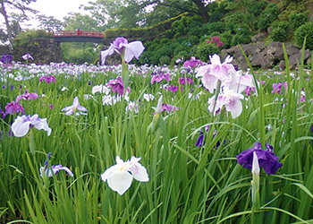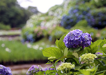 ‘東堀花菖蒲園’に咲く花菖蒲と、その横の斜面に咲く色とりどりの紫陽花は圧巻であった。 |