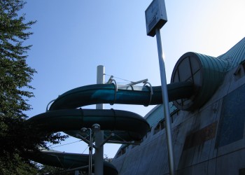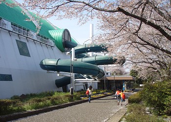 「温水プール」には、大小2本のチューブスライダーがあり、それそれ中学生以上と小学生以上が楽しめる。 |