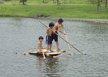置いてある材料や道具を使って、勝手に筏を造り池に浮かべて遊ぶことができる。