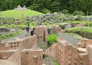 頂からローラー滑り台で麓まで滑り降りるのはとっても豪快。麓にあるつるつるの石は、滑り台なのだろうか?何とも魅力的だ。 |